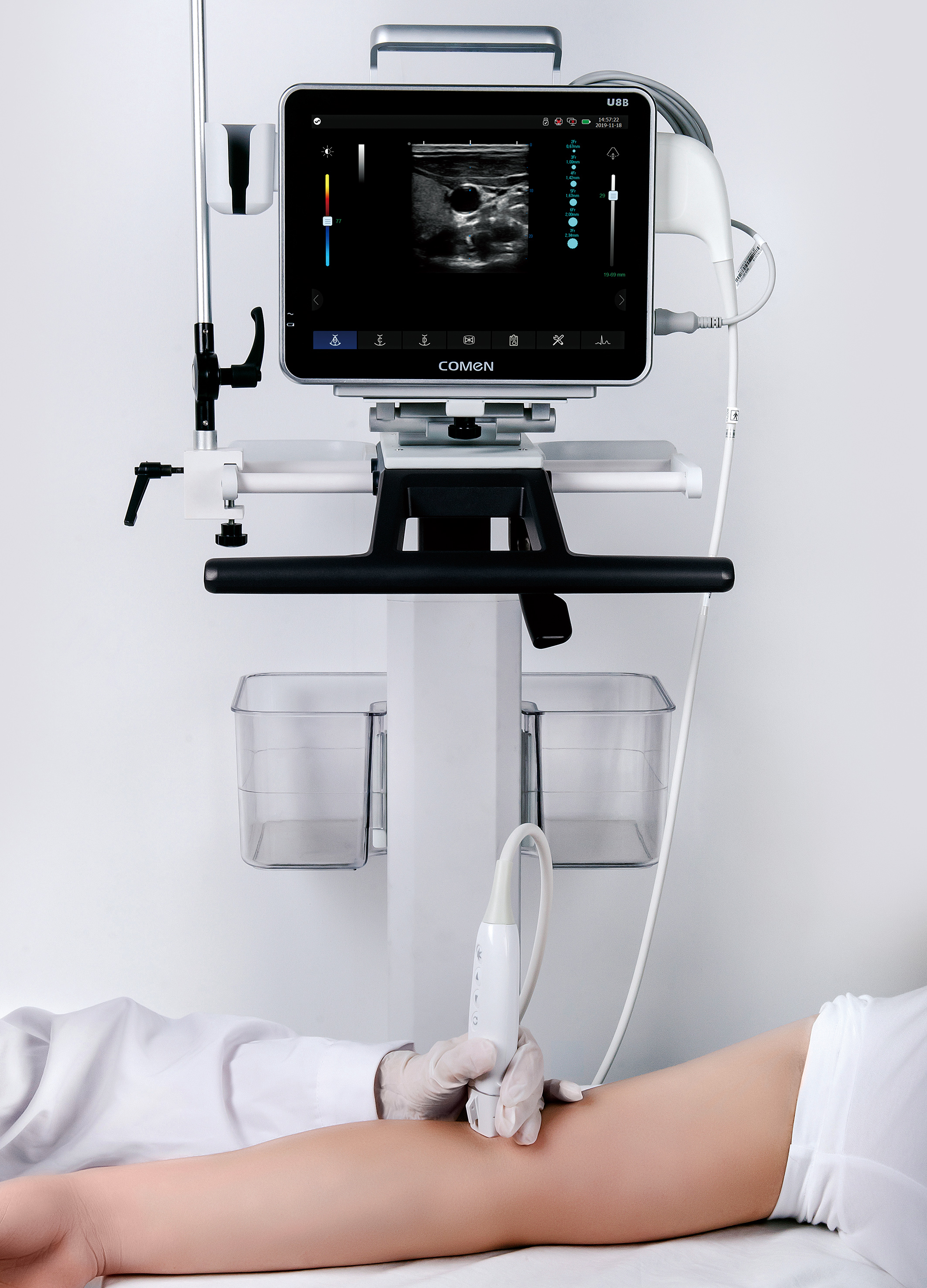 3、In addition to being used for ultrasound-guided vascular puncture & central venous catheter guidance and positioning, this device is also applicable to different departments with its ultrasound monitoring function, enabling one machine to be used for multiple purposes. The concept of minimalist design is adopted as a whole, which perfectly combines a concise dedicated operating system with an ultra-thin and portable appearance. The equipment is light and portable with an ergonomic handle, which is convenient to be transported between departments.