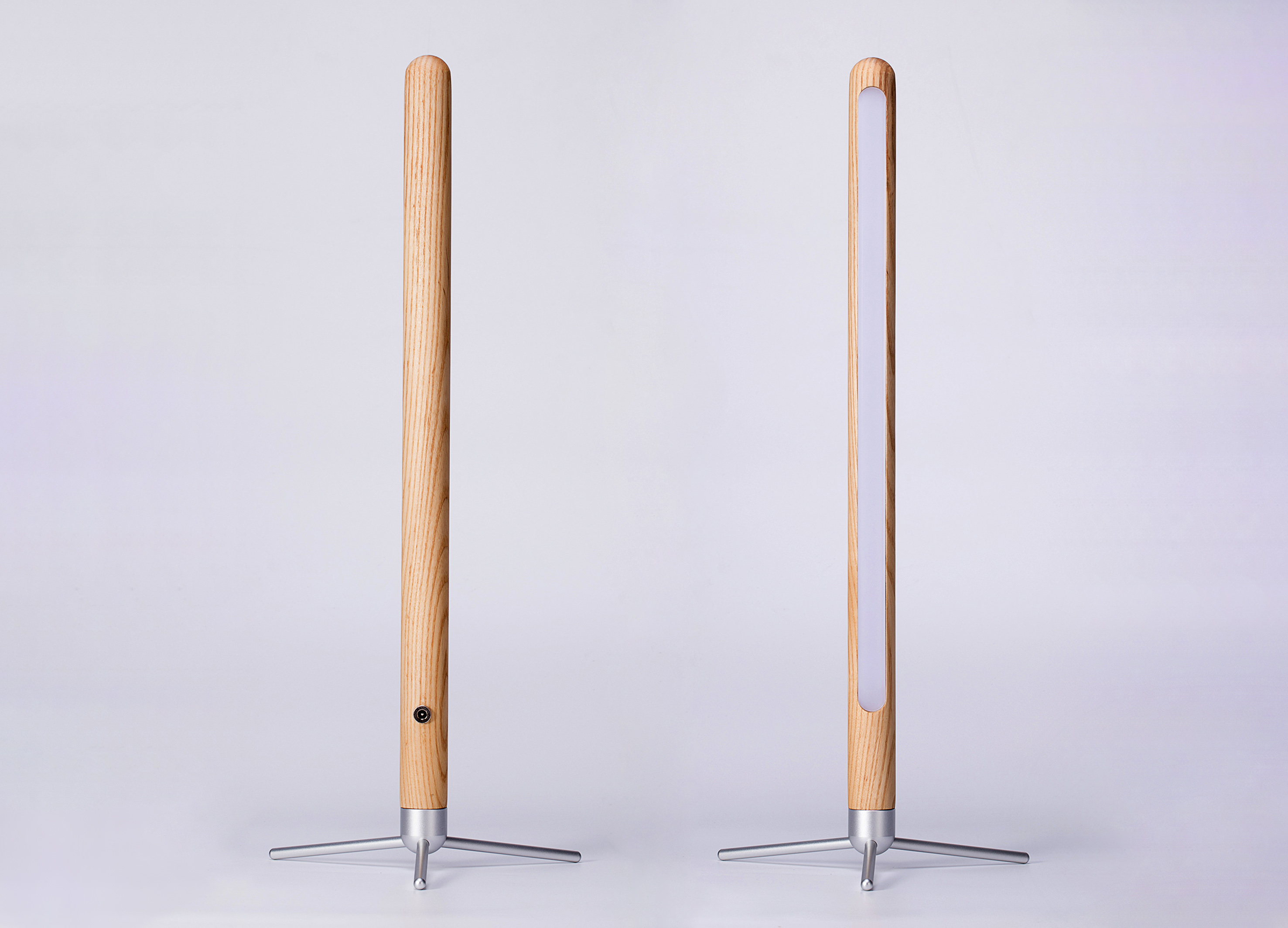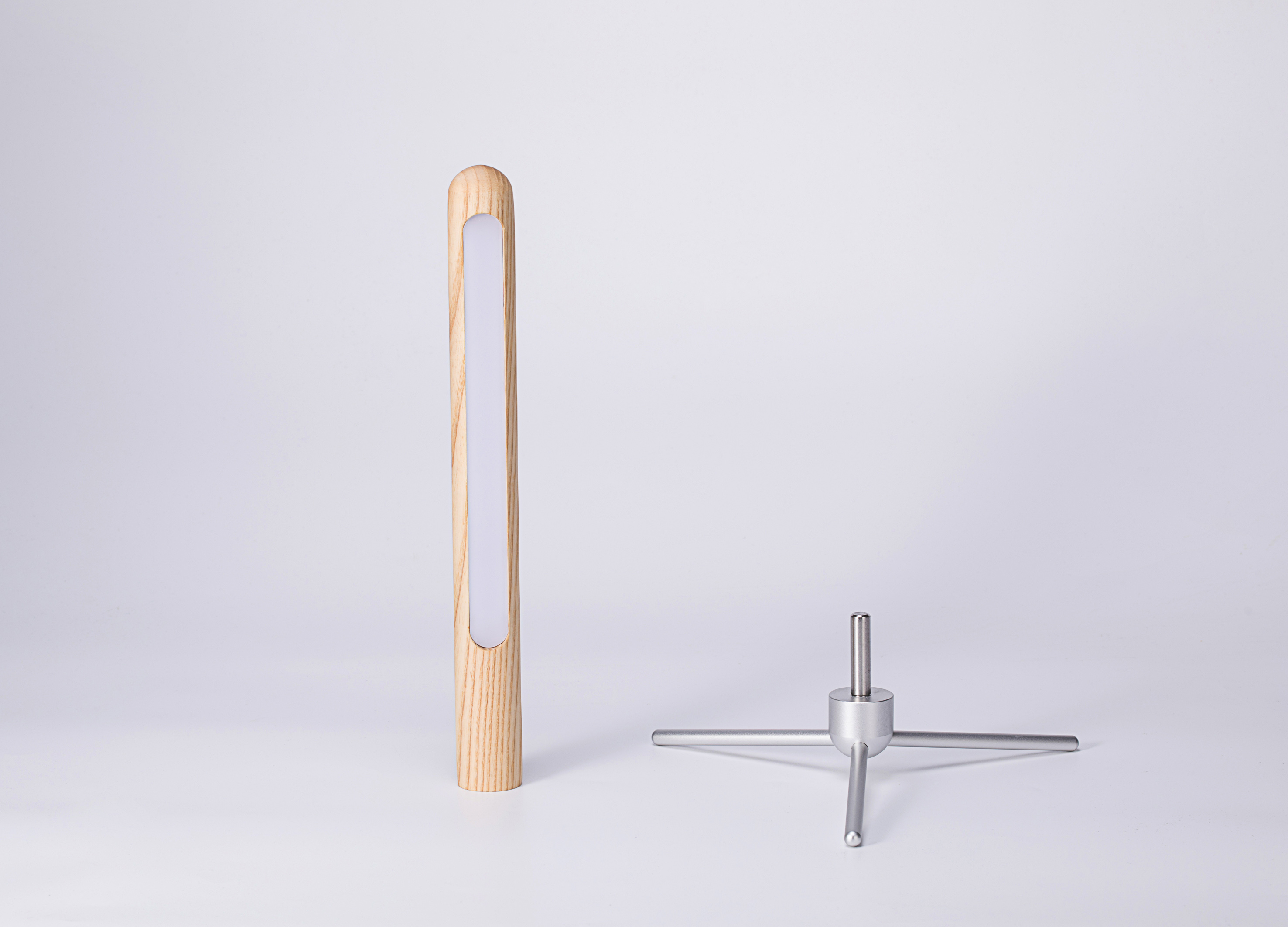 The product is made of warm solid wood and aluminum alloy, which displays a perfect combination of natural aesthetics and modern technology. Well, it has a three-legged vertical structure and can be dissembled, with the light emitting stick fixed on the base. The device can be adjusted in different directions, and it has a curved, smooth, delicate, simple and harmonious appearance.