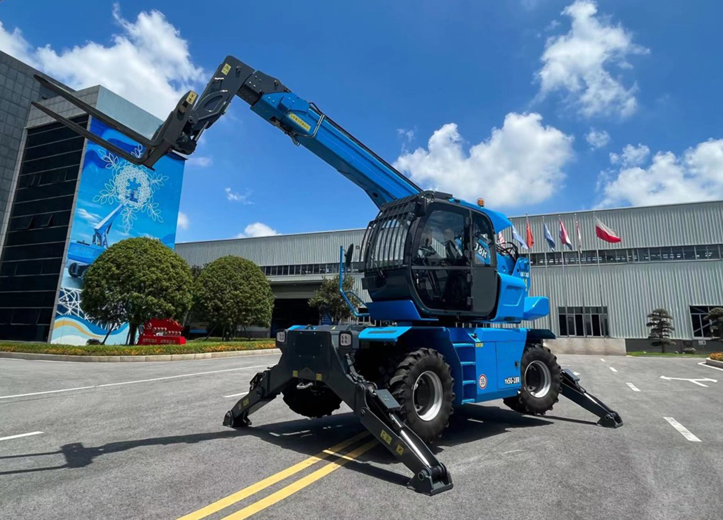 Intelligent slewing telescopic handler TH50-18 fully absorbs the advantages of traditional construction machinery such as truck cranes, loaders and forklifts, and can complete the tasks of fork, loading, lifting, grasping, lifting, clamping, moving and towing according to the actual working conditions. Applicable to construction, industry, agriculture, forestry, mining, film and television, railway and other fields.The product has a variety of steering modes, excellent mobility performance; Hydrostatic transmission system, with good off-road performance; Modular accessory design, standardized interface and quick disassembly structure design, so that the product can quickly change different accessories according to the actual working conditions, fully cope with the "fork, lifting, loading, grabbing, lifting, clamping, moving, towing" and other comprehensive working conditions, perfectly fit the market for the telescopic arm forklift truck products "one machine can do more" diversified needs.Intelligent slewing telescopic handler TH50-18 uses "wind" as the design concept, the whole contains the static potential of the motionless movement and the motive force ready to start. Partial fully consider the use of lines, design elements collocation, show industrial beauty and scientific and technological elements. Blue painting, reflecting the calm and restrained style of science and technology, echoes with the corporate image, the appropriate color embellishment, making the overall appearance more rich and smart. Fully demonstrate the determination and strength of the enterprise to create intelligent, efficient and accurate excellent products such as Yufeng Valiant.The product is equipped with automatic fork leveling system, telescopic arm forklift LMI system, self-locking multi-mode steering system, suitable for all kinds of loading and unloading, short-distance transportation and other conditions. More than 20 cutting-edge technologies such as 360° panoramic images and fatigue monitoring are applied, and the boom buffer shock absorption system is newly developed to ensure the personal safety of drivers and improve the comfort and experience of personnel. Intelligent functions such as working location memory, automatic identification of working equipment, intelligent fault diagnosis, troubleshooting guidance system, remote screen projection and remote system upgrade are configured to make the operation more intelligent and simple.