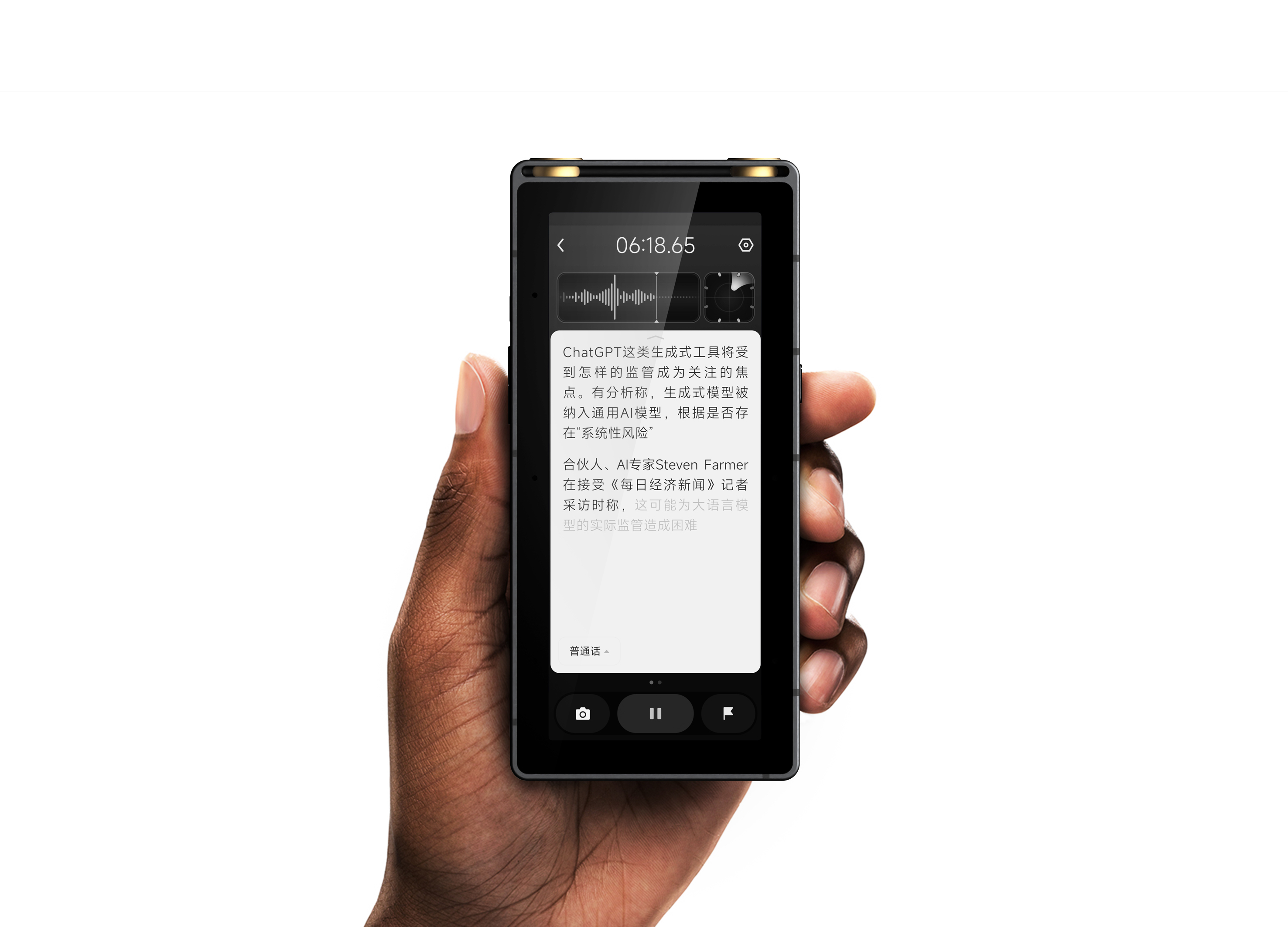 As demands for efficient recording and retrieval of information in business and legal sectors increase, traditional recording devices no longer suffice. Products that integrate AI large models handle the intelligent transcription and simultaneous interpretation of multiple languages in meetings, speeches, and interviews, significantly enhancing office and information processing efficiency.A front array of six omnidirectional microphones plus two top directional microphones, equipped with core noise reduction algorithms, adaptively cater to high-demand scenarios such as lectures and forums up to 15 meters away, as well as comprehensive recording situations like multi-person meetings and discussions,it also be used to log directly into conference software for real-time meeting minutes recording.The device boasts a sleek, robust appearance with a rectangular design that is both compact and lightweight.The SR503 is more than a recording device,it also transcribes in real time, extracts text, and is both efficient and easy to use, enhancing productivity with quick transcription. Supports multiple languages, including dialects and international languages, suitable for various scenarios.Constructed with Series 7 aluminum, enhancing the product's texture.Features a metal case protecting the microphones and a wear-resistant frame design. The layout of the volume and recording buttons is ergonomically designed to ensure a comfortable user experience.The product supports transcription and recognition of 12 Chinese dialects and two minority languages, playing a significant role in cultural communication, exchange, and text recording. Utilizes iFlytek Voice Cube technology and noise reduction technology, suitable for complex environments, with a maximum pick-up distance of 15 meters. Offline transcription and OCR extraction are based on AI technology, enhancing work efficiency and convenience.Uses green organic silicone leather for better environmental and health benefits.The rear camera can capture content such as PPTs for text extraction, allowing for rapid transcription and translation. Equipped with a large AI model, it quickly standardizes and extracts critical information from texts.