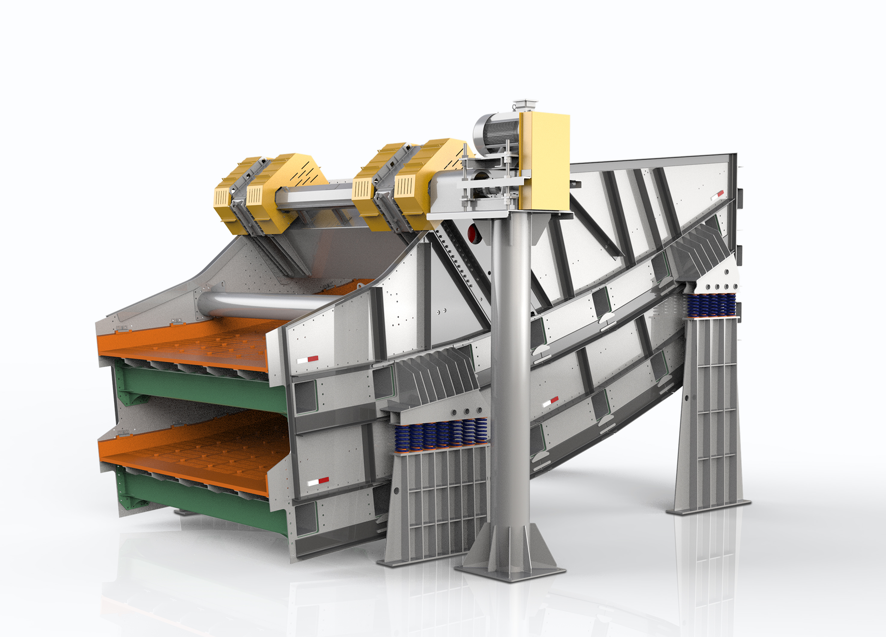 Along with our country mine toward“Green, intelligent, safe, high-efficiency” the transformation upgrade new development pattern, to improve our large screening equipment technology in the failure rate is high, the processing capacity is small, the intelligence degree is low, the basic theory research is weak, the competitiveness is insufficient and so on, it has far-reaching strategic significance to the high-quality development of China's mining and screening industry.This product is equipped with intelligent control system, real-time on-line monitoring of the working conditions of vibrating screen surface and vibration exciter gearbox, platform software including network data transmission and database software, equipment Detection and fault diagnosis software and remote management terminal software, can effectively reduce the probability of fault screen machineThis product is based on the metal-sensitive side plate to create a WAR-A appearance, designed to show the screen of the damage resistance and high strength. Screen machine parts to cross the form of line and surface, enhance the screen machine hard sense. With Gray and white as the main color, with yellow embellishment, both reflects the scientific and technical sense of the screen, but also lose the lively atmosphere.The reflective strip is pasted on the side of the product to play a warning role and ensure the safety and reliability of the working environment