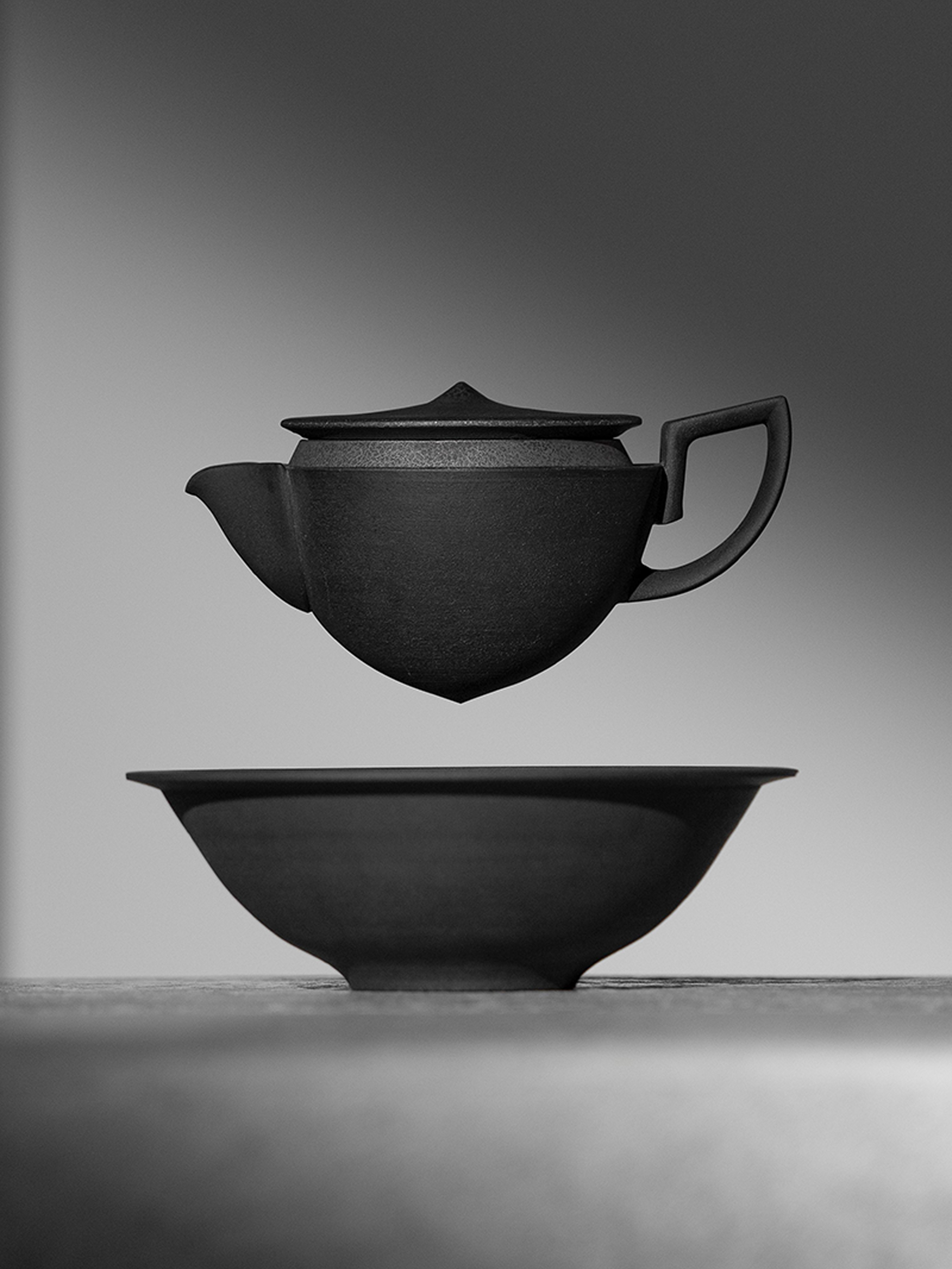 Inspired by the spinning gyros of the Hemudu culture, this tea set breaks away from traditional teapot forms. The designer adopts a geometric cutting approach, deconstructing the dynamic triangular form of the gyro into fundamental geometric elements—points, lines, and planes. These elements are then reimagined into the components of the teapot and accompanying pieces, blending cultural symbolism with modern design language.The overall shape of the tea set can be abstracted into "upright triangles" and "inverted triangles" of varying sizes and heights, striking a balance between "stability" and "instability" and imbuing the teaware with a rhythmic flow. The designer seeks harmony between form and function, not only emphasizing aesthetic appeal but also ensuring ease and comfort in use—blending visual creativity with user-focused practicality. Crafted from rare, mineral-rich black clay, the teaware subtly enriches the tea’s flavor, offering a smoother and more refined experience.1. The teapot’s gyro-inspired pointed base and swirling textures formed by hand-throwing evoke a vivid sense of motion—symbolizing cosmic rotation, the passage of time, and the cycle of life. 2. During pouring, the pointed-bottom teapot guides the tea leaves into a gentle whirlpool, allowing aroma and flavor to release more evenly. 3. The perfectly matched teapot stand provides stability and visual harmony, while echoing the deeper philosophy of balance. In a constantly shifting world, finding stillness and clarity is essential. The use of Gaogu black clay lends the set a timeless, forward-looking character.Energy Efficiency: Optimized temperature control improves firing success rates, reducing overall energy consumption during production.