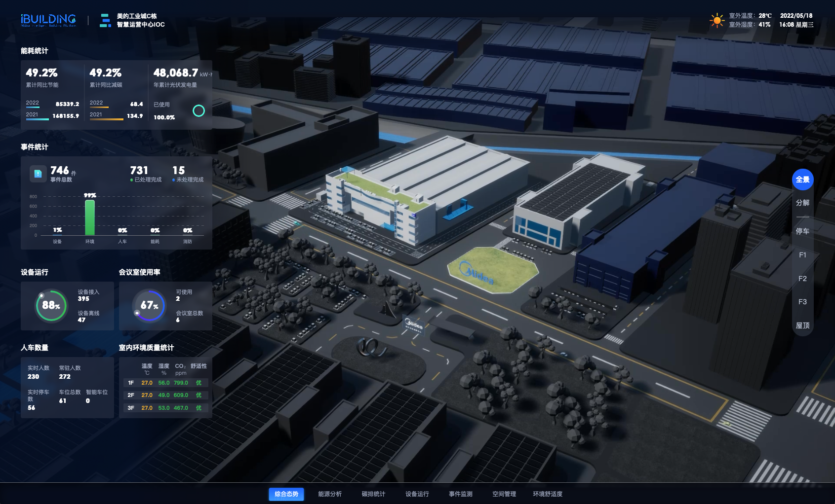 The intelligent management centers around the iBUILDING to provide a LIFE digital smart park solution which relies on six platform capabilities, combining its own products and business with digital twin technology to link people, equipment and space. Based on iBUILDING, we’ve carried out intelligent transformation and used one APP and one backstage center to create 15 application scenarios and 26 products which include a total of 110 core function modules and 40+ types of equipment. As a result, the system covers smart travel, office, operation and maintenance to form a safe, efficient and low-carbon smart park model.