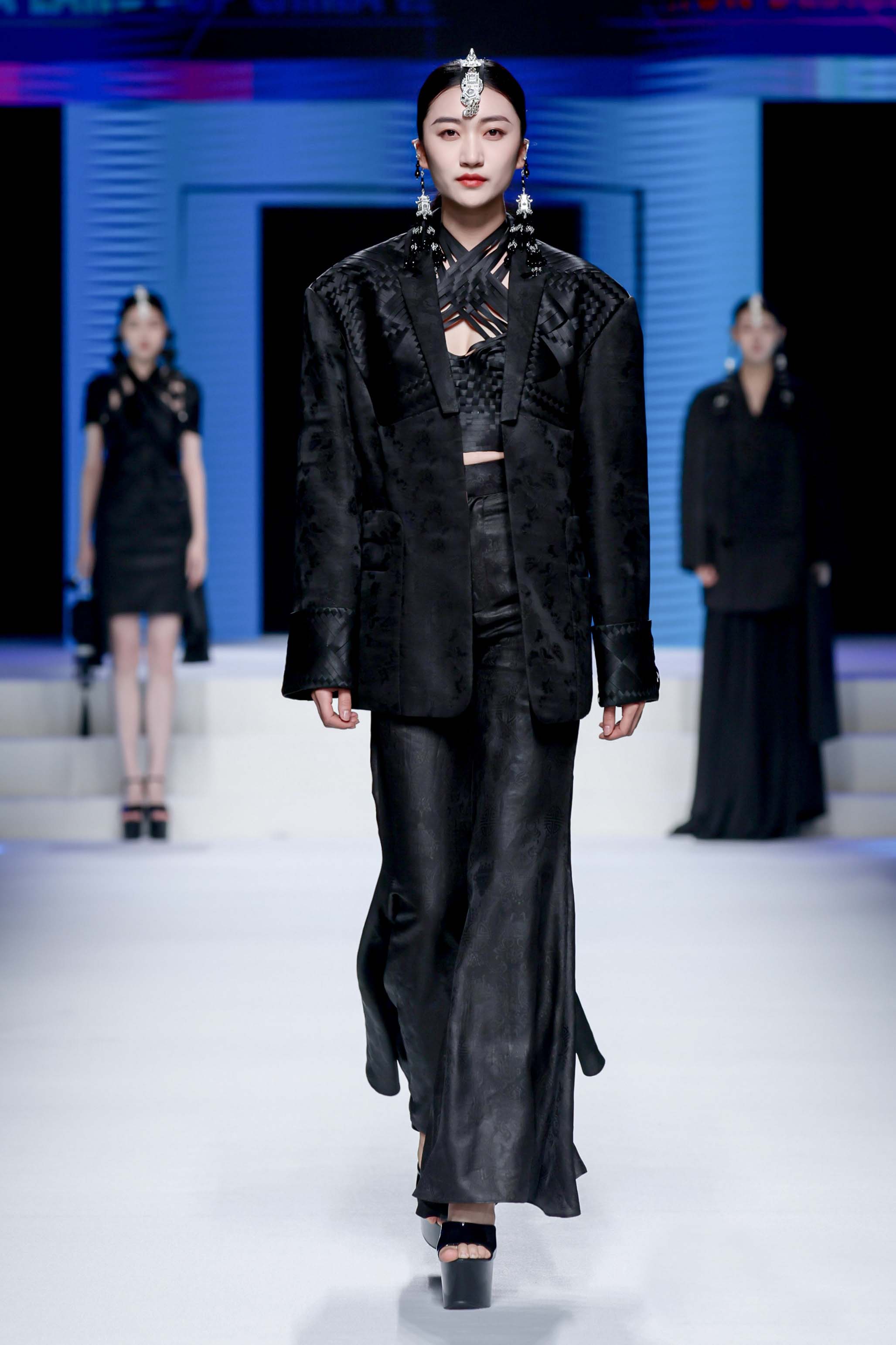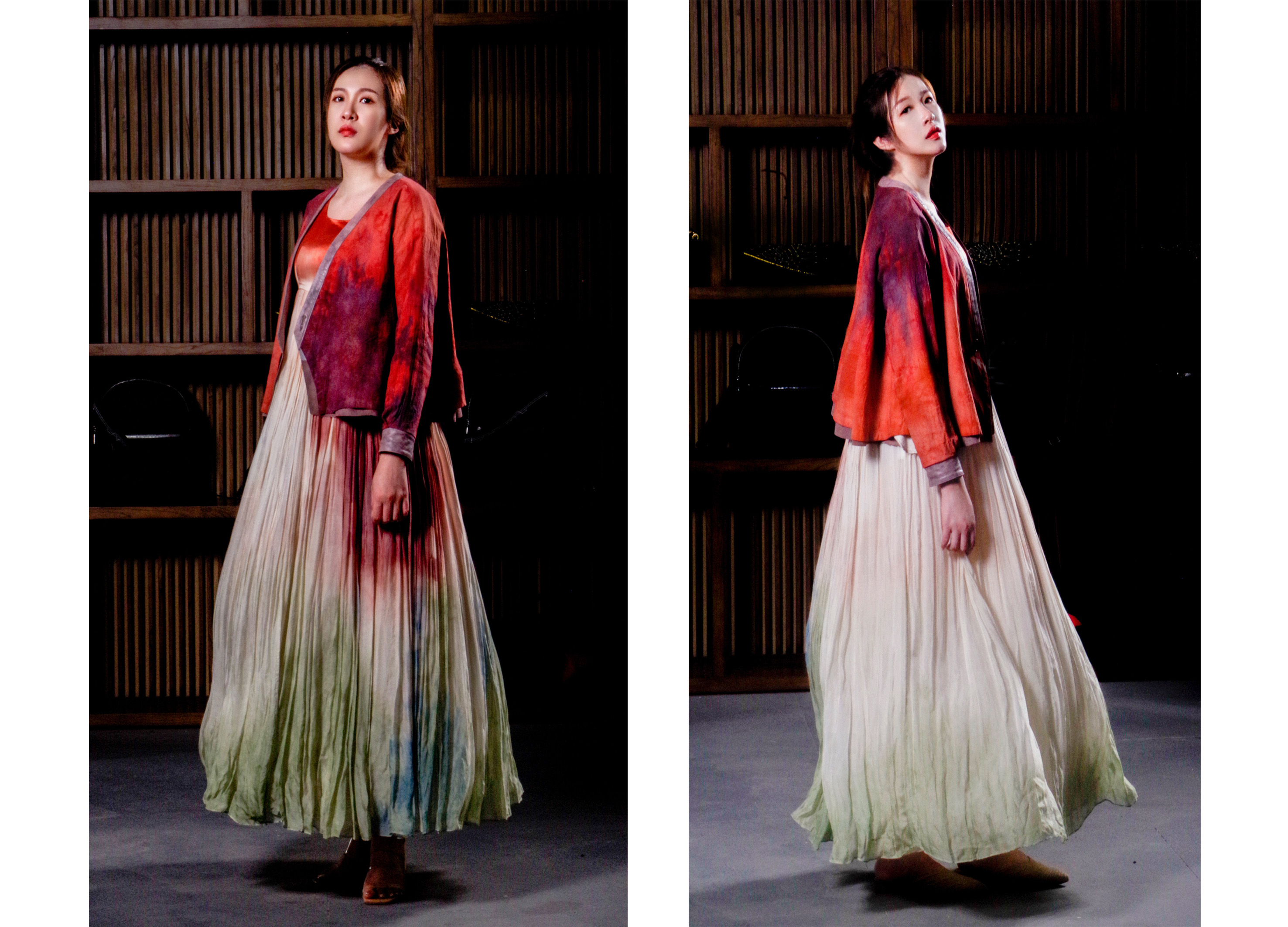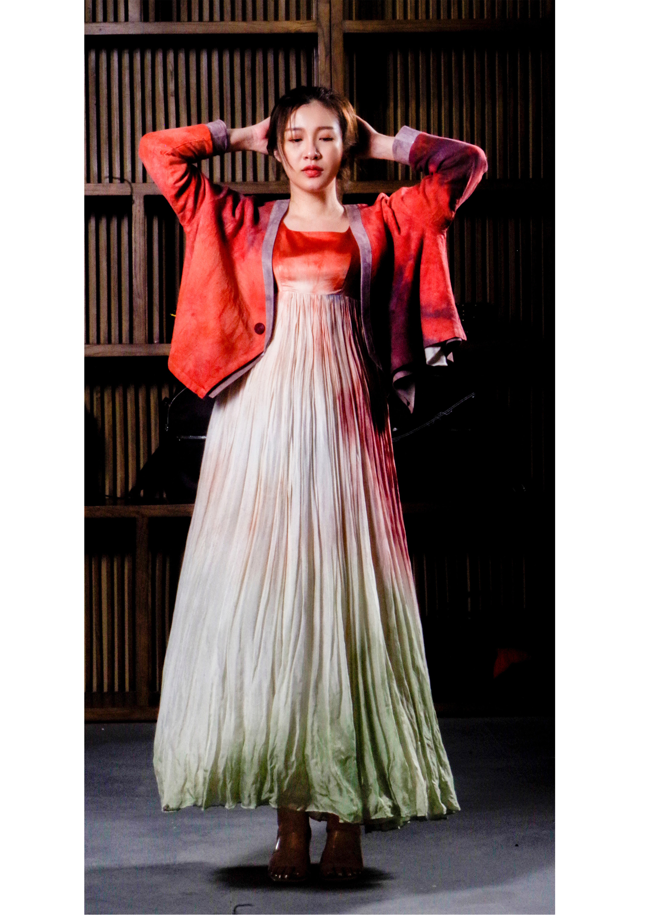 The design inspiration comes from a poem by Qin Guan of the Northern Song Dynasty, which reads 。The inspiration for the jumpsuit skirt comes from the Tang Dynasty high waisted skirt, while the inspiration for the short top comes from the Tang Dynasty short jacket and Silk shawl.The high waisted skirt is made of silk chiffon and uses various plant dyes,The elegant and cloud like skirt is full of patterns and colors, and the connection between colors is as natural as if it is easy to come by.The short shirt is made of cotton and linen, using a plant tie dyeing process of orange and purple, which is rich and colorful.。。。