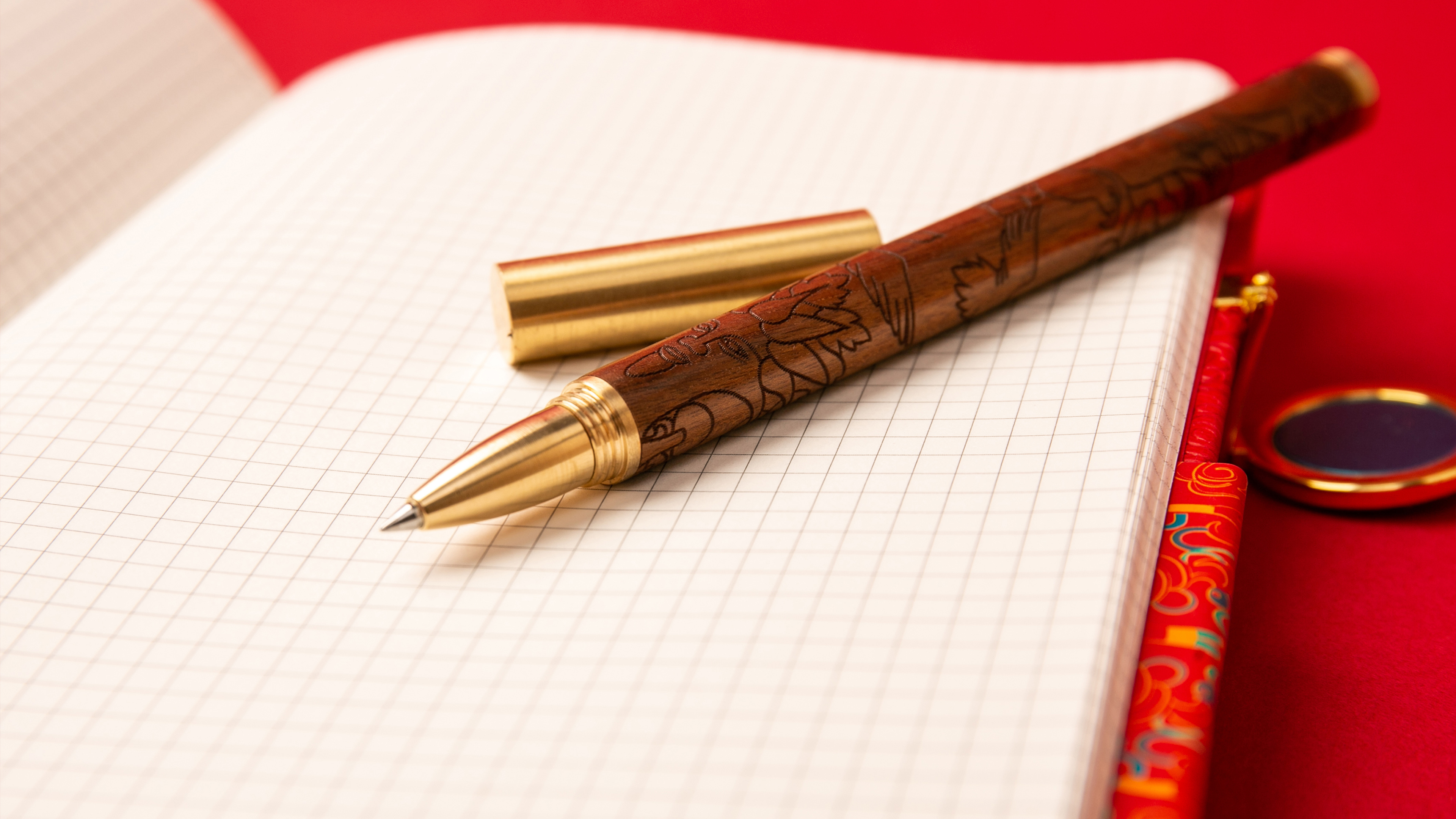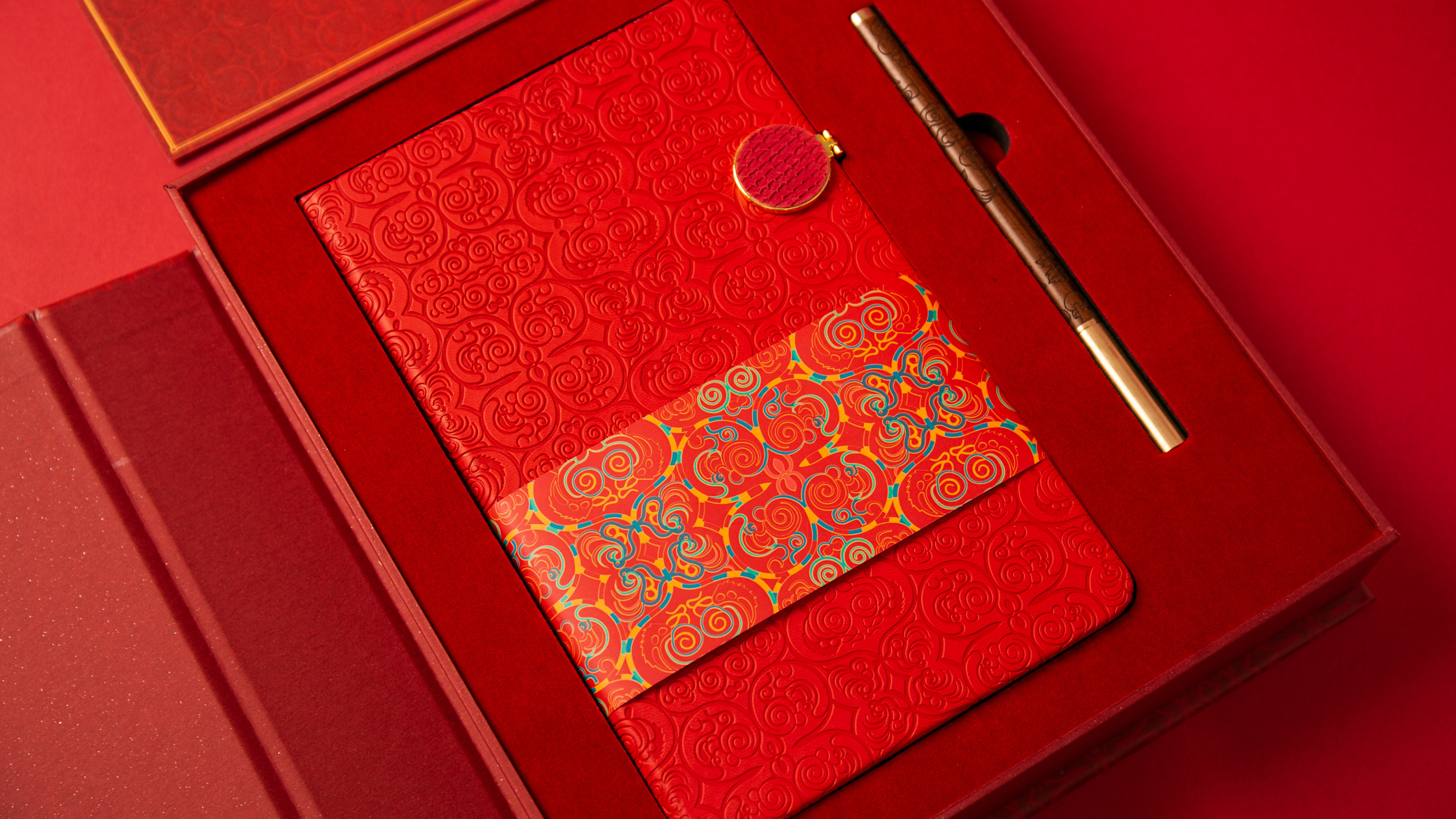 The unique feature of this notebook is the use of the Hezhe pattern with a fish skin inlay metal clasp. The pattern is inspired by the ethnic costume of the Hezhe people, and the designer has made a clever two-sided continuous and repetitive design based on the traditional pattern, resulting in a pattern of flowers and flowers. The metal buckle is combined with fish skin to show the unique and exquisite fish skin skills of the Hezhe ethnic minority non-heritage culture.The wooden body of this pen features intricately carved scenes from the Imakan chant, depicting the Tree of Life in full bloom and a graceful swan soaring through the air. Above the auspicious clouds, an eagle fearlessly fights its way through the sky, breaking through obstacles and soaring to greater heights, representing the indomitable spirit of the Hezhe people to overcome challenges and reach for the top.This Hezhe Fish Bookmark draws inspiration from the integral role that fish play in the fishing and hunting culture of the Hezhe people. The bookmark is crafted from brass metal, and its exquisite design features a streamlined shape that mimics the natural curves of a fish. The hollowing process, combined with fine polishing and partial enamel work, creates a simple yet elegant atmosphere. The dynamic form and graceful curves of the bookmark convey a sense of joy and happiness, reminiscent of a fish swimming freely in water. The symbolism of the bookmark is particularly apt, representing the wish for the recipient to navigate their life and work with ease and comfort, much like a fish in water.This USB is designed with red and gold color scheme, the main body is vermilion, echoing the gold cap, showing the noble temperament. Vermilion is considered a symbol of good luck in the culture of the Hezhe people, while gold represents power and wealth, highlighting the designer's in-depth understanding of the culture of the Hezhe people and heritage. The delicate texture and carving process makes the USB flash drive more three-dimensional and textured, and the gold lid design is both beautiful and practical.