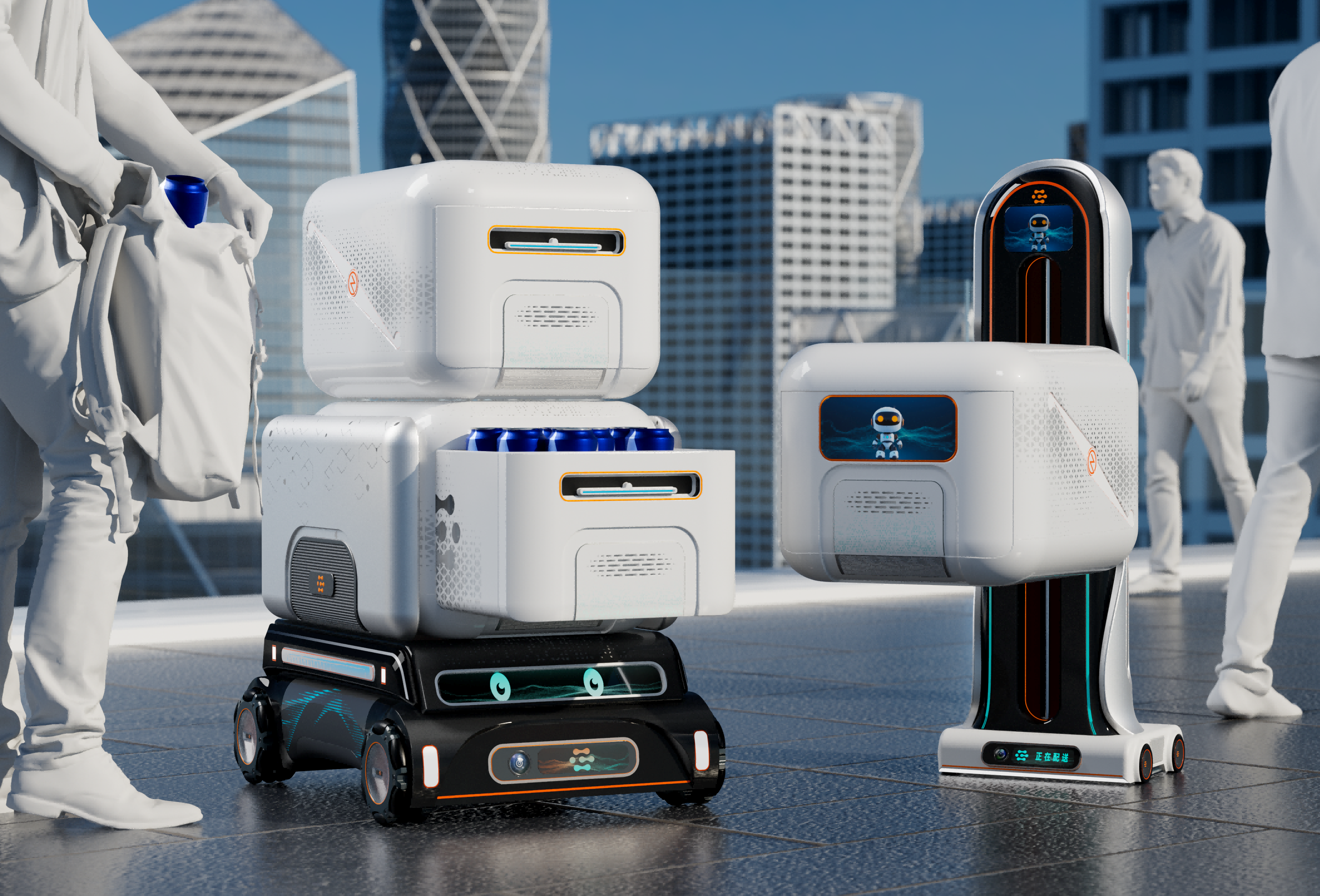 In the fast-paced rhythm of modern urban life, the "last mile" delivery challenge has become increasingly prominent. With delivery services often unable to enter residential communities, packages and food orders pile up at entrances. This not only presents a significant challenge for community management but also creates risks of mistaken identity, loss, and cross-contamination. This invisible wall is a major barrier to convenience. To address this, the intelligent modular delivery and transfer vehicle concept was born. It is not merely a cold robot, but a future community service ambassador embodying efficiency, safety, and a touch of warmth. It is committed to providing a seamless, intelligent, and humanized end-to-end delivery solution.In terms of materials, the upper section features a smooth finish, while the lower section uses a matte texture. This stark contrast enhances the overall layering and premium feel.We have built an intuitive and cohesive multi-modal interactive experience. From the interactive screen at the top, to the clear light indicators in the central drop-off zone, and the operational status display at the bottom, a complete visual guidance flow is formed. Combined with clear voice interaction and feedback, even first-time users can complete pickups effortlessly, ensuring a minimal learning curve.Its overall form is sleek and streamlined, with a side gradient texture that extends naturally, imbuing the static device with a strong sense of dynamic tension. The anthropomorphic "eye-like" lights on the front give the vehicle a warm, lifelike quality, bridging the gap between human and machine. The color palette is based on a sophisticated silver and black, accented with vibrant blue and orange to inject a visual focal point and a sense of technology.Using recyclable materials, electric power helps reduce carbon emissions.