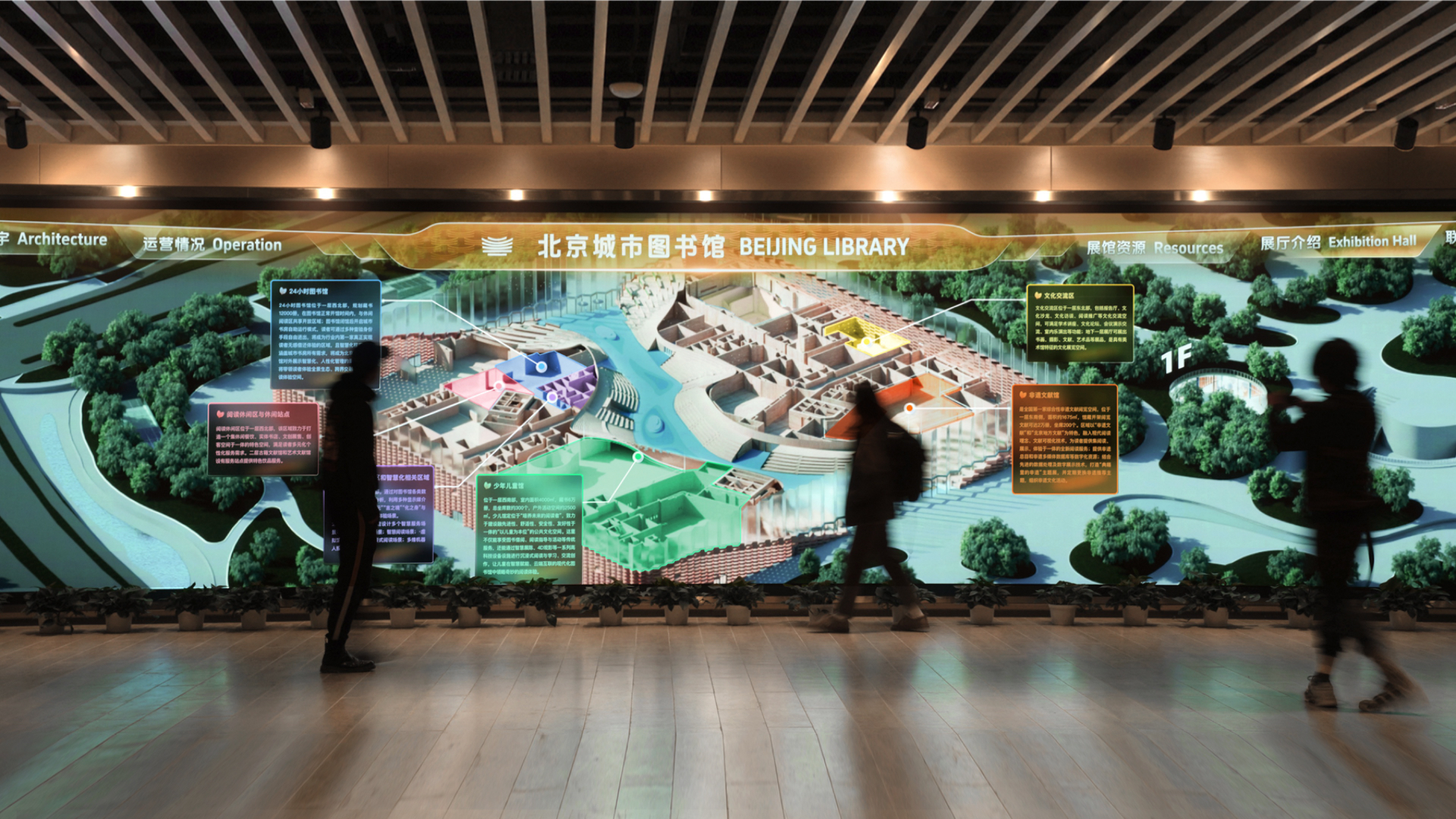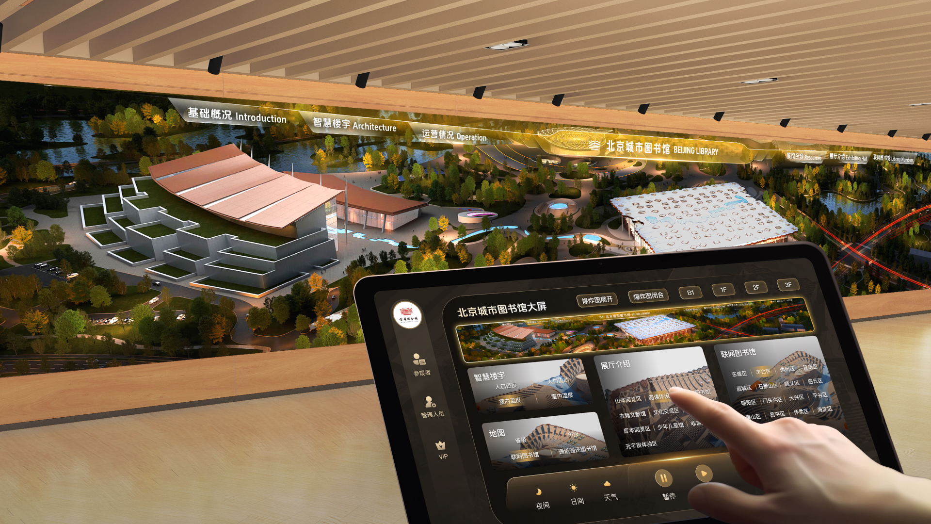 The Beijing Library Data Visualization System is an interactive platform designed for readers. Powered by an 18-meter-long, 3-meter-high giant digital screen that replaces traditional physical displays, the system serves as a vibrant interactive focal point in the library's welcome area, attracting visitors to explore the library's premium content and services.With versatile interaction modes for different scenarios, readers can control bionic architectural models in real time via touchscreen or tablet to easily access facility information, book collections, and real-time monitoring data. The design team blends data visualization with the library's natural aesthetics—interfaces feature nature-inspired elements and seasonal color palettes, including plant-shaped icons and stream-valley-style data panels. This fusion of functionality and artistry creates a new digital identity for the library, reigniting public interest in reading.This project adopts a centralized server room deployment model, based on the Alibaba Cloud DataV platform and powered by the self-developed CityV engine to achieve real-time rendering of digital twin scenarios. The hardware configuration includes large-scale physical screens and radar sensing devices to support dynamic data interaction. The design team employed tools such as Unreal Engine, C4D, 3D Max, AE, and Sketch to develop UI panels, 3D models, and motion effects, while integrating AIGC technology to enable visual effects such as day-night cycles, seasonal transitions, and festive themes. The ultra-wide screen fully displays data content, combining engaging interactions and branded design to allow users to effortlessly access high-quality information and services through simple yet entertaining screen interactions.The system enhances the utilization rate of library resources through digital services, replacing paper-based guides with cloud data to reduce paper waste, protect the ecological environment, and promote healthy and sustainable development. Its modular design extends display lifespan, while smart sensors optimize energy consumption for low-carbon operation, improving both product flexibility and user-friendliness. Through personalized algorithms, the system increases public cultural engagement while maintaining practical functions like reading navigation, embodying the humanistic principle of "Technology for Good."The design inspiration of this system originates from recreating people's beautiful memories of reading under trees, on lawns, and amidst nature. By fusing information technology with natural landscape elements, the interface incorporates the seasonal transitions of spring, summer, autumn and winter. The system binds multidimensional data to architectural models, allowing readers to explore highly realistic models of bionic valleys, terraced fields, streams, and ginkgo forests through touchscreen interactions. They can observe real-time information feedback from different library areas, including themed exhibition halls, book collections, lecture activities and special exhibitions, as well as environmental monitoring data like visitor flow, air quality, temperature and humidity.The system supports multiple interactive modes: readers can remotely switch and view screen content through tablet terminals. After selecting target modules on screen, the large display will trigger dynamic data scenarios supporting customizable themes and diverse scene switching. Readers may also directly approach the screen for close-up interactions, which will activate localized data pop-ups and dynamic feedback while supporting multi-user simultaneous operation. In standby mode, the screen automatically plays preset scripts, presenting vast dynamic data landscapes that blend technology with natural aesthetics, delivering functional yet artistic interactive experiences.This seamless integration of technology and nature not only revitalizes the library's digital image but also reignites people's interest in reading through immersive storytelling approaches.In terms of environmental sustainability, the system creates a diverse cultural digital space by regularly updating content themes and virtual data assets, reducing material and energy consumption. When no one is near the large screen, it adjusts brightness based on ambient lighting and plays dynamic visuals, minimizing excessive power usage and light pollution while seamlessly integrating with the underground space and lighting environment.