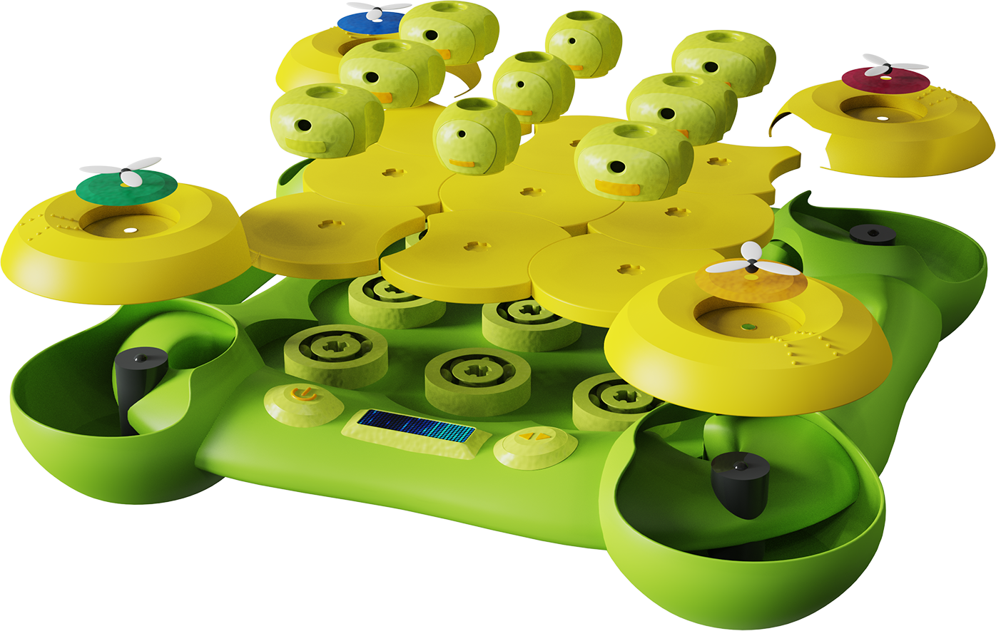 The design inspiration for this waste-sorting toy stems from observing and reflecting on traditional environmental education methods. We noticed that current waste classification teaching often remains at the dull stage of rote memorization using paper flashcards, where children passively receive knowledge without practical opportunities, and what they learn in school rarely translates to real-life scenarios. To make environmental education truly engaging, we drew inspiration from Montessori's "work cycle" theory to create a unique rotating interactive design. As children turn the game disk to deposit waste into corresponding sorting slots, they not only receive immediate tactile feedback but also naturally grasp classification knowledge through play while developing hand-eye coordination. The rotating mechanism's mechanical structure was inspired by fidget spinners, with gear rotations enhancing tactile experience to attract children. Considering the learning needs of different age groups and the importance of family interaction, we specifically designed parent-child collaboration and versus modes, allowing children aged 4-10 to find appropriate challenge levels while growing together through interactive play with parents. The internal structure of the waste bins incorporates electric motor principles to provide positive reinforcement, transforming environmental learning into a fun adventure filled with a sense of achievement.This innovative waste-sorting toy employs a multi-level interactive design to combine education with entertainment. At its core is a rotating system composed of interlocking circular puzzle pieces - children turn the main block with magnetic waste models to align them with corresponding sorting zones. The rotation mechanism adopts the smooth bearing principle of fidget spinners for effortless operation. Each sorting bin contains magnets and a micro-motor system; when a correctly matched magnetic waste model is rotated into position, the magnetic attraction activates spinning copper blades inside, creating visual feedback. The toy also features a smart system that tracks scores, displays rankings, and delivers environmental knowledge through an interactive interface, making the learning process both engaging and fun.The design process of this waste-sorting toy originated from observing and reflecting on traditional environmental education methods. The initial concept emerged after witnessing children mechanically memorizing classification cards in class without translating knowledge into action. We first established the core concept of "turning sorting into a game," aiming to create a toy that combined hands-on operation with learning. During the conceptual development phase, we experimented with various interactive forms and ultimately drew inspiration from the smooth rotation of fidget spinners to determine the basic rotating puzzle block structure. The first prototype used 3D printing to create simple circular blocks and four sorting slots, but testing revealed that while children enjoyed the rotating action, they lacked sufficient feedback motivation. This led to the second-round design incorporating a magnetic attraction system and rotating blade feedback mechanism - when waste models were correctly sorted, the built-in copper blades would spin rapidly, significantly increasing children's engagement. Testing also highlighted varying difficulty needs across age groups, prompting the development of an adjustable difficulty system by altering magnet spacing and block sizes to accommodate children aged 4-10. The final major improvement was adding a smart scoring system using a micro-controller to record game data and provide real-time feedback through a small display, making the learning process more goal-oriented and challenging. The entire development underwent 12 prototype iterations, evolving from rudimentary cardboard models to the refined final product. Each testing round deepened our understanding of children's learning styles and interests, ultimately resulting in this entertaining yet educational environmental toy.