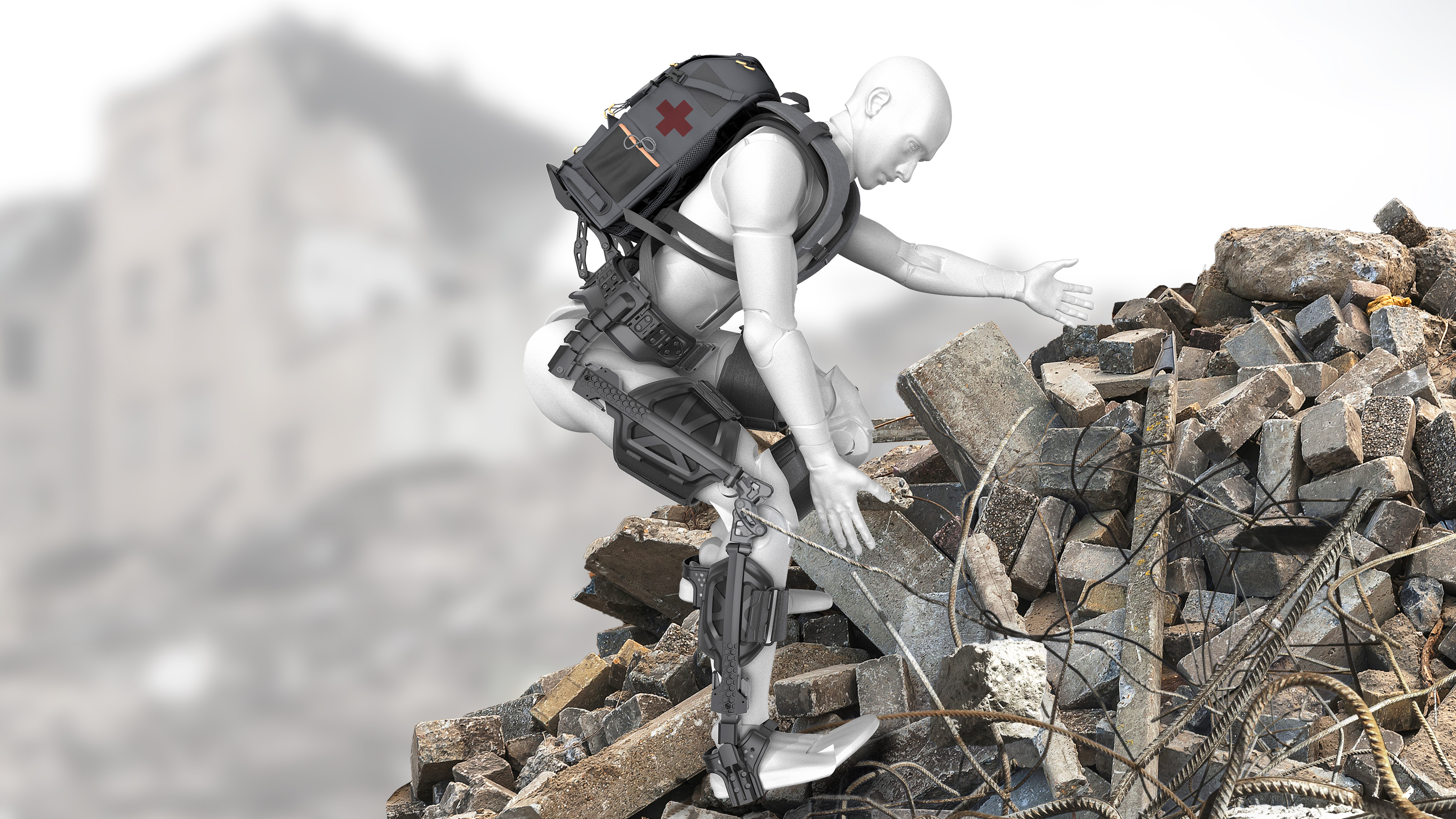 在军事巡逻、野外探索、灾害救援等场景中,人员常需在复杂地形(如山地、废墟、丛林)中执行长时间、高负荷任务,传统外骨骼多针对工业或医疗康复设计,难以满足动态、高灵活性需求。 本产品旨在突破传统外骨骼的局限性,为高强度动态任务开发一款兼具高灵活性、轻量化和无源驱动的下肢助力系统。针对边境巡逻、野外勘探及灾害救援等特殊场景中复杂地形和持久作业的挑战,设计重点解决三大核心问题:一是通过仿生四连杆膝关节结构实现人体运动的高度适配,使穿戴者能自然完成奔跑、攀爬等高动态动作;二是采用创新材料与结构优化,在保证50kg负载能力的同时将重量控制在3.5kg,大幅降低使用者的代谢消耗;三是通过纯机械无源设计,避免能源依赖,确保在野外环境中的可靠性和持续作业能力。该设计不仅填补了市场在动态任务专用外骨骼领域的空白,更为特种作业人员提供了革命性的移动辅助方案,显著提升其在复杂环境下的机动性、持久性和任务执行效率。核心技术:1.无需电力驱动,实现永久续航。2.搭载全自由度仿生关节系统,贴合人体自然运动轨迹,确保使用过程中灵活自如。3.通过负荷转移与重构技术,减轻身体负担,提升长时间作业舒适性。4.轻便贴身,便于快速穿脱。 材料工艺:产品主体采用回收塑料增强尼龙玻璃纤维复合材料与可回收航空铝,具备出色的物理、化学性能,确保长效耐用与环境适应性。软质部件选用再生尼龙,减少资源消耗与碳排放,体现环保理念。此款外骨骼可有效防止长时间负重所导致的肌肉拉伤与关节损伤;且穿脱简单,仅凭挂扣、插扣固定。 突破了现有外骨骼的活动强度及自由度程度,通过膝关节四连杆仿生结构,实现外骨骼达到全自由度,使用户可以进行快速奔跑、打滚等高灵活性动作。产品贴合人体曲线造型,无负担感,可内穿于外套,兼具高效灵活与实用价值。外骨骼遵循功能与形式相结合的原则,通过镂空结构兼具轻便和美观性,可调节背部与腿部适配不同身高,提升舒适度。采用刚性组件结合软带的设计,负荷从肩部转移到腰部再到地面,有效防止肌肉拉伤和关节损伤。 材料方面为了大规模生产,采用用尼龙玻璃纤维复合材料与航空级铝材制成,轻质耐用。此外,纯机械结构无需动力,减少维护成本, 整体设计功能性与美观性兼具,外形简洁现代,贴合人体工学,满足用户在高强度任务中的实际需求。本外骨骼产品无需电源驱动,适用于边境巡逻、野外考察和灾后救援等资源匮乏地区,能够在紧急环境中提升作业效率,减轻社会资源压力,发挥积极的社会效益。 其硬质部件采用回收塑料增强尼龙玻璃纤维复合材料和可回收航空铝材,确保耐用性和可回收性,减少磨损与资源浪费。软质部件使用可再生尼龙,由废料和海洋塑料提取,生产过程中有效节约石油资源,降低污染排放。