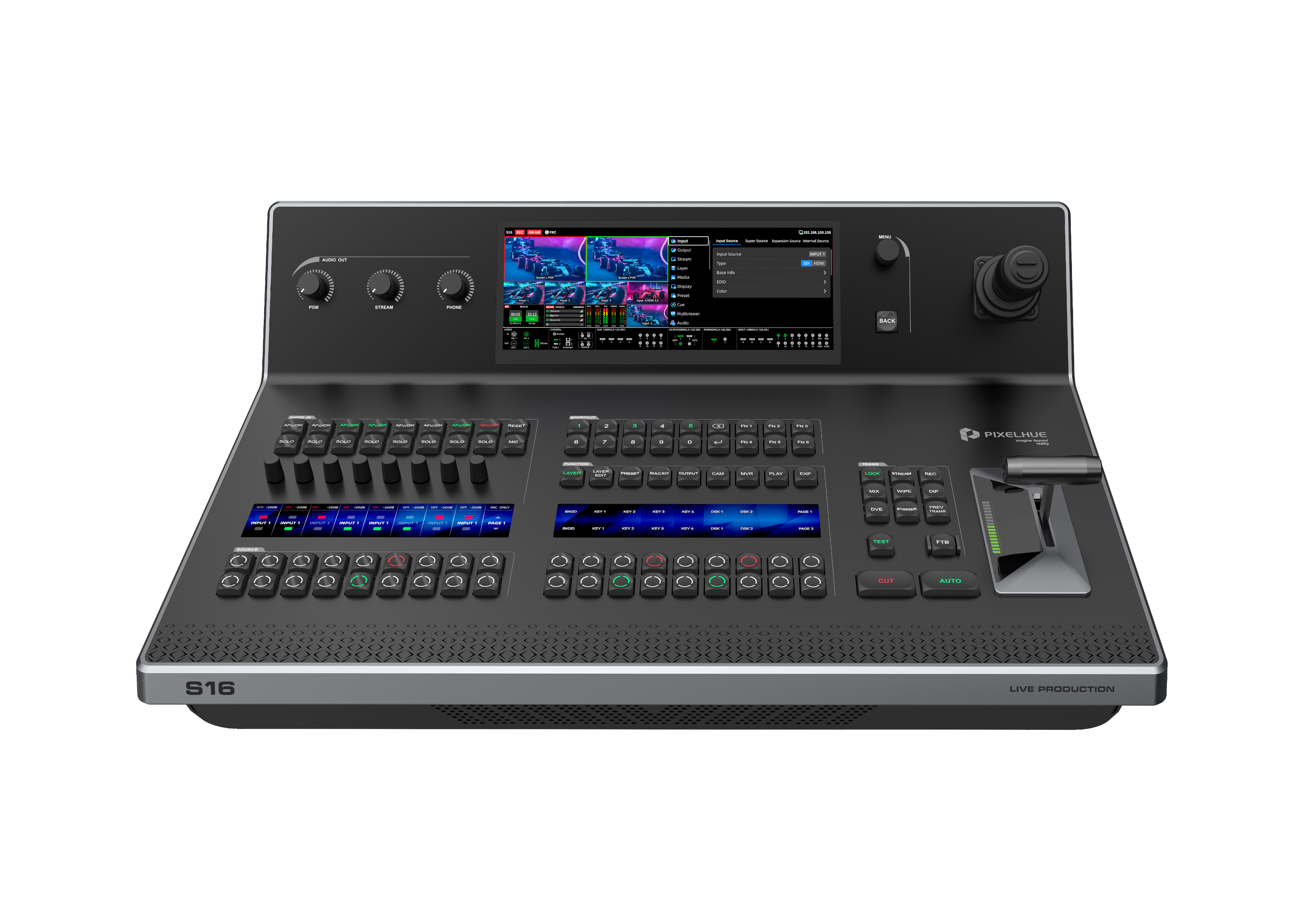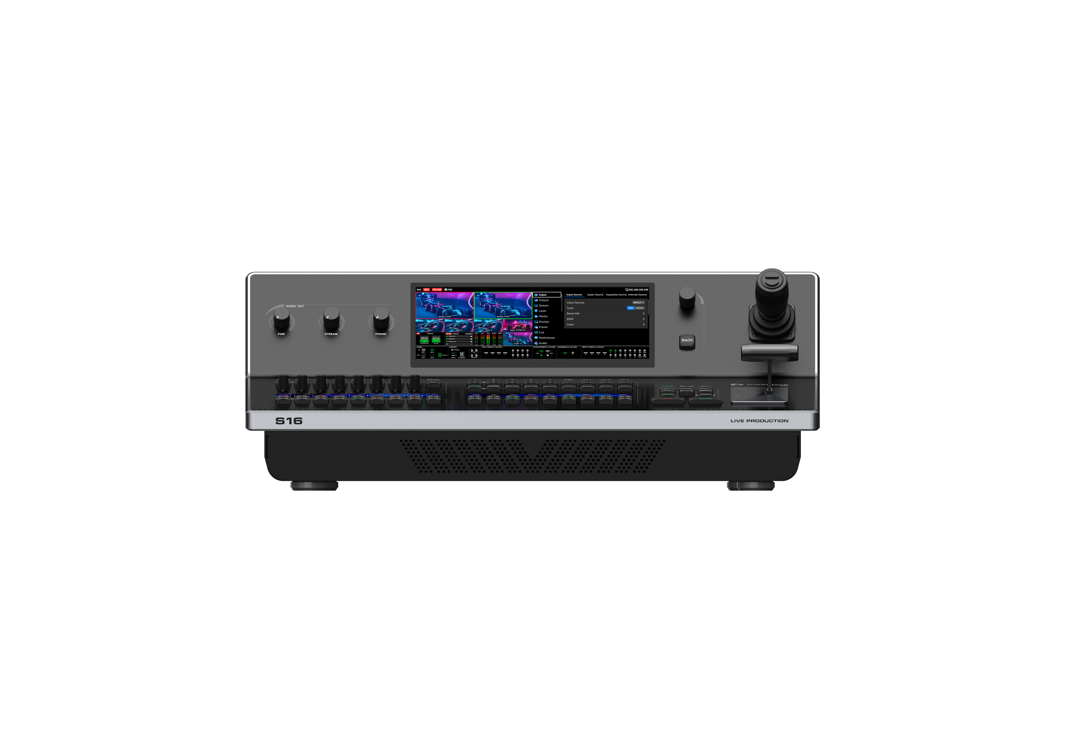 S16 是一款为满足专业直播和多媒体制播的高性能4K一体化导播台,多场景全覆盖,为创意制作提供无限可能。1.全链路4K输入输出体验: 1)捕捉每一个细节,全链路4K及以下自适应输入,让清晰成为标准; 2)灵活的输出设置,支持UHD、HD分辨率上下变换及自定义分辨率选项,满足您对各种活动的精准要求; 2.接口与图层资源的丰富盛宴: 1):拥有音频控制算法、UVC视频采集/输出、RTSP推流等核心技术,支持行业领先的色度、亮度抠图、支持不占资源的异形抠图;搭载16接口12通道,接口丰富程度在同级别产品中遥遥领先,为创意搭建无限舞台; 2)拥有行业领先的图层资源配置,行业领先的最高4K@60 UVC输出,包含1路BKGD、4路KEY、2路DSK、1路LOGO、1路Supersource等,让创意无处不在; 3.全能直播模块,连接全球观众: 1),无论是直播推流还是在线编辑包装都能轻松应对; 2)支持国内外各大直播平台,可4路同时RTMP直播推流。1.核心技术为用户提供更流畅稳定的技术支持,结合XR+直播个性化高端方案,满足用户个性化直播需求,为创意制作提供无限可能。 2.广播电视级性能,民用级操作,便捷易用,为用户提供极致的操控体验: 1)简约科技的多屏显示一体化设计,液晶+操作面板相结合,单机可完成100%配置场景,让现场调试编辑更直观; 2)人性化的按键排布与细节设计,巧妙的按键复用逻辑,拓展出200+按键功能;按键、摇杆、旋钮等多种操作方式满足用户各种操作需求; 3)快拆设计理念,使得维护与部件更换轻而易举。 3.直播全链路解决方案,多场景全覆盖: 广泛应用于商业活动、文娱活动、体育赛事、社区和宗教活动、教育和培训、电子竞技和游戏直播,以及个人和小型工作室制作等各种场景。